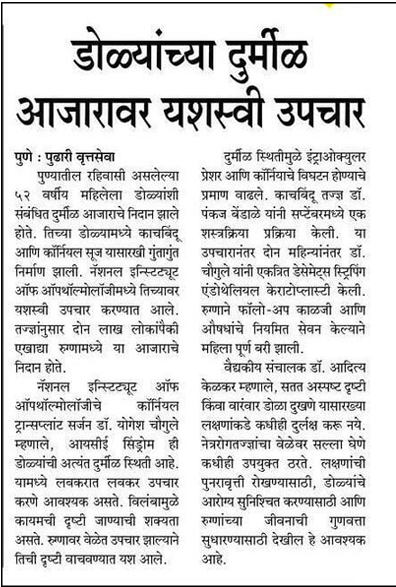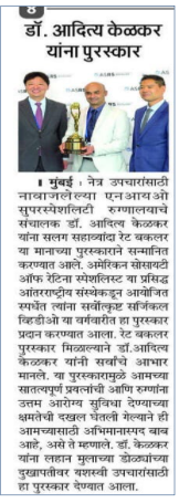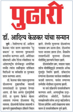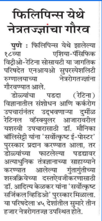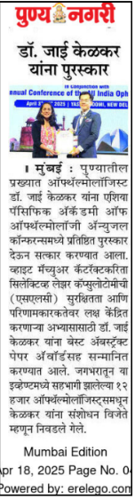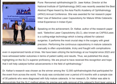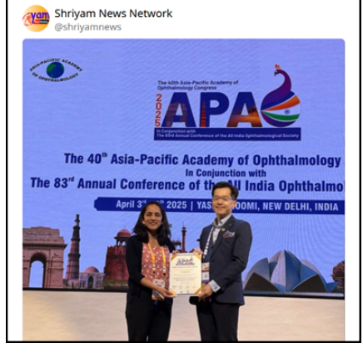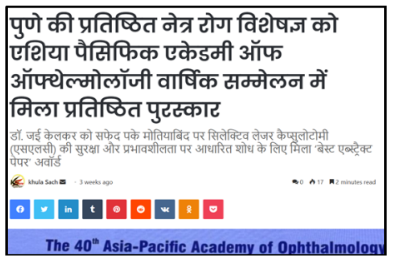 Pune ki Pratishthit Netra Rog Visheshagya ko Asia Pacific Academy of Ophthalmology ke वाषक समेलन mein mila pratishthit puraskar.