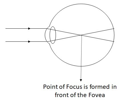 In a myopic eye (short sightedness), the axial length of the eye is larger than normal. Thus the rays of light do not form a point focus on the fovea, and so the eyesight is blurry. The adjacent diagram shows how point focus is formed in front of fovea, not on the fovea.