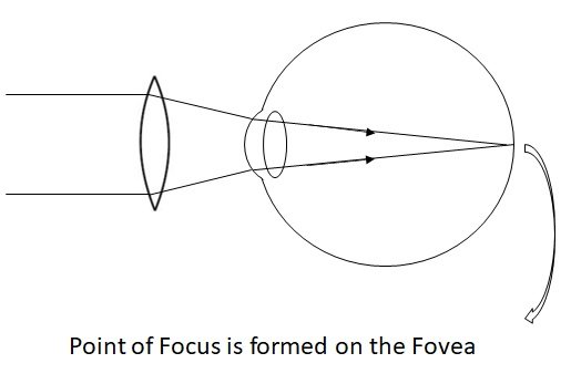 The below diagram shows the optics of the normal eye. Rays of light form a point of focus on the retina (sensitive part of eye), and therefore the eye can see clearly without any aid.