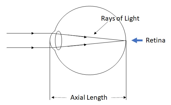 In a myopic eye (short sightedness), the axial length of the eye is larger than normal. Thus the rays of light do not form a point focus on the fovea, and so the eyesight is blurry. The adjacent diagram shows how point focus is formed in front of fovea, not on the fovea.