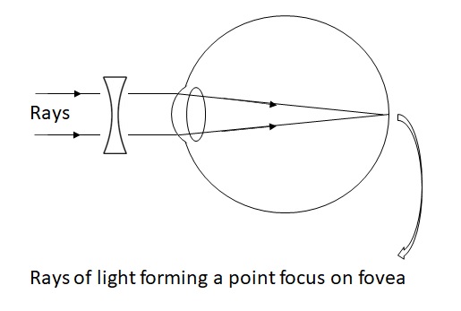 When we put a concave lens (minus number lens) in front of the eye, the rays of light falling on the eye, make a point focus on the retina, thus enabling the eye to see clearly.